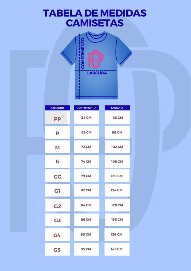 | Tamanho | P, M, G, GG, G1, G2, G3, G4, G5 |